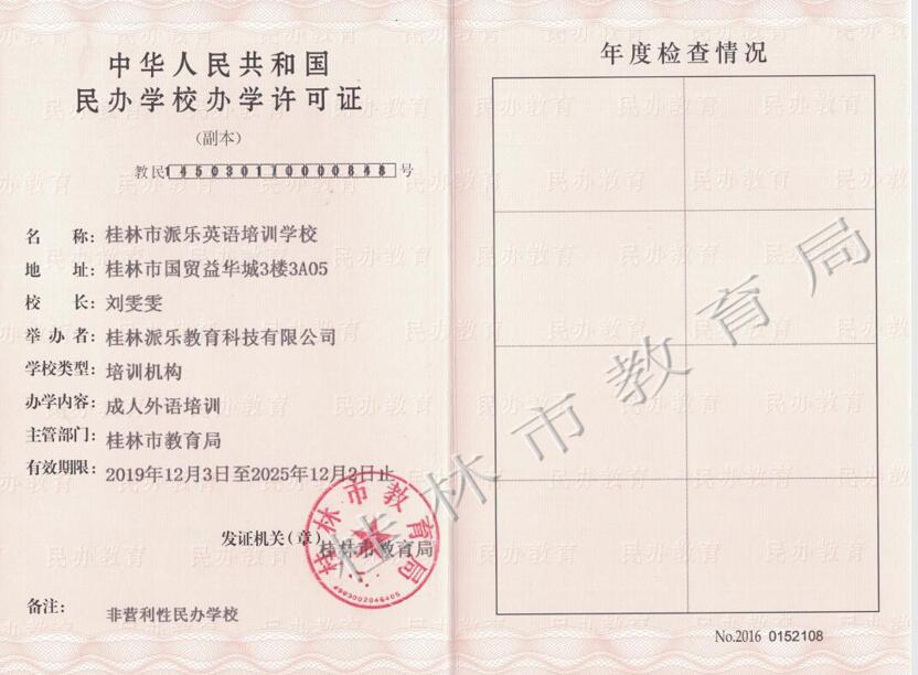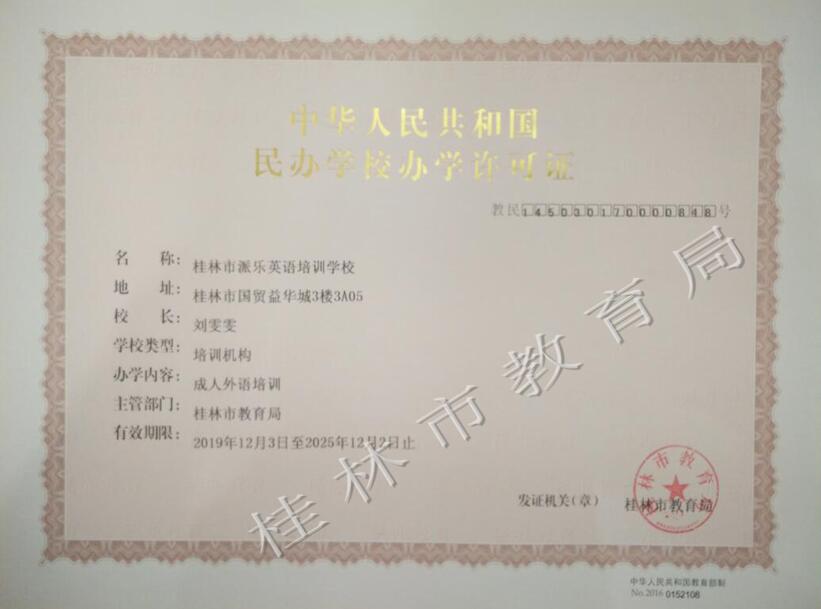 桂林市派乐英语培训学校办学许可证(正副本)