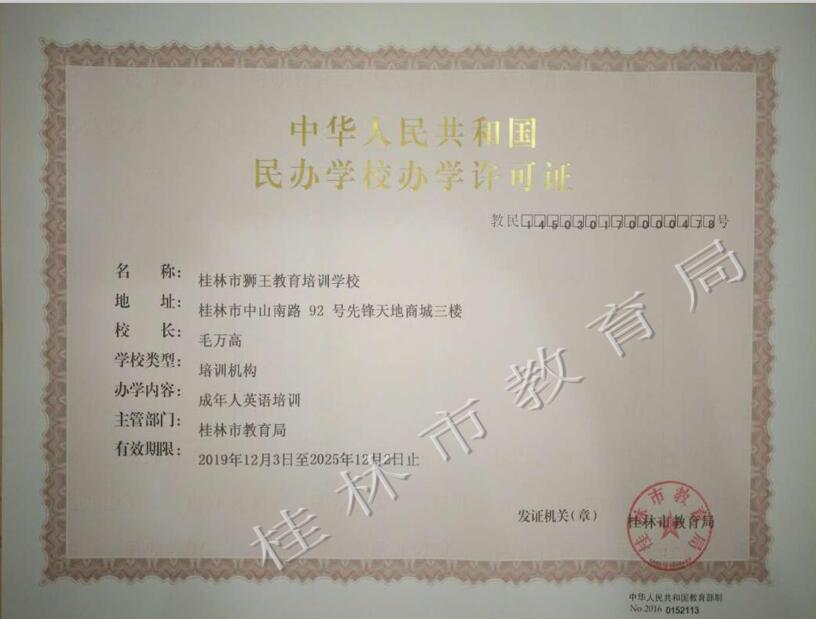 桂林市狮王教育培训学校办学许可证(正副本)