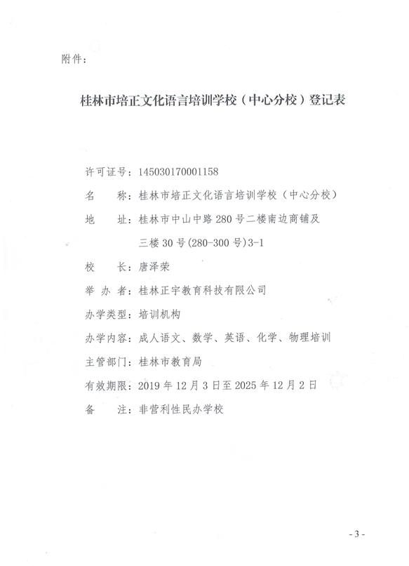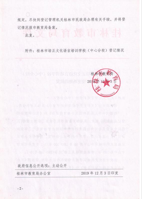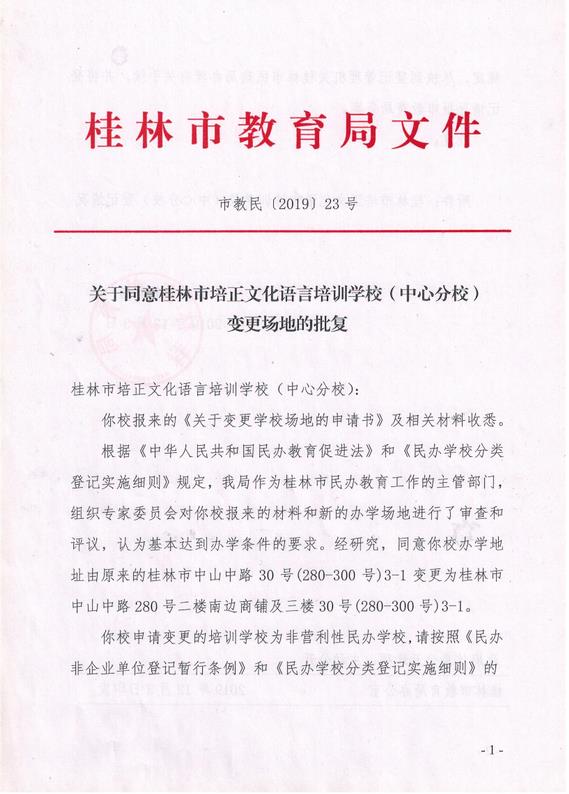 关于同意桂林市培正文化语言培训学校(中心分校)变更场地的批复 (市教民〔2019〕23号)