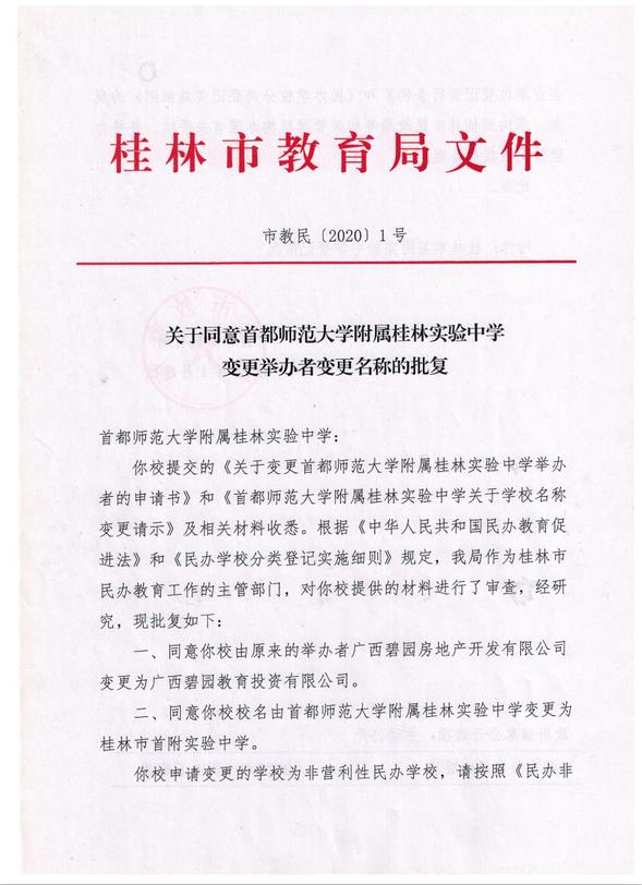 关于同意首都师范大学附属桂林实验中学变更举办者变更名称的批复(市教民〔2020〕1号)
