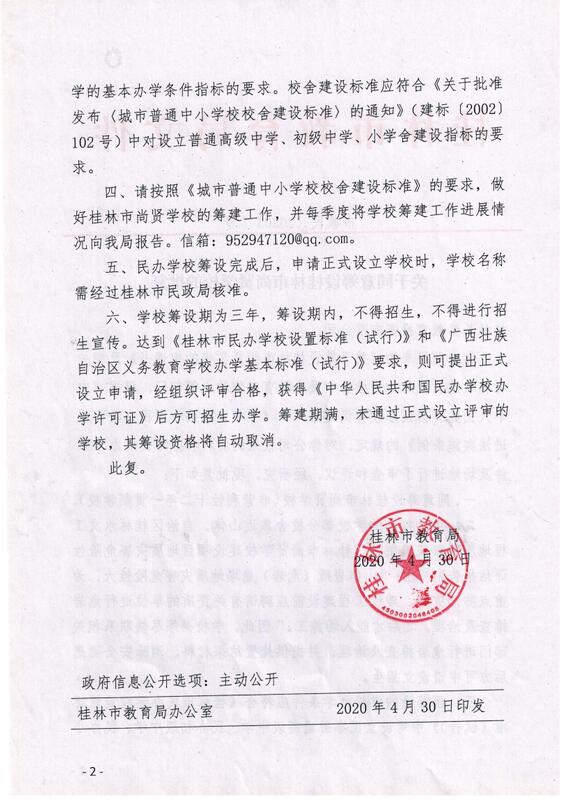 关于同意桂林长盛教育投资有限公司筹设桂林市尚贤学校的批复》(市教民〔2020〕7号)