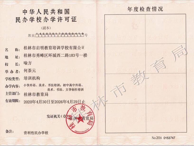 桂林市启明教育培训学校有限公司办学许可证(正副本)