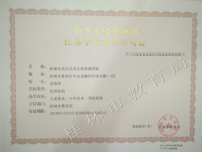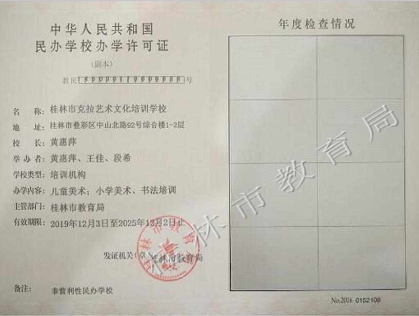 桂林市克拉艺术文化培训学校办学许可证(正副本)