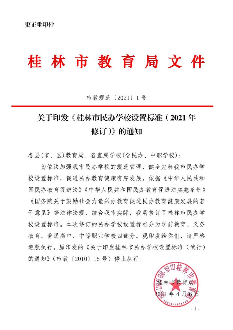 市教规范 〔2021〕1号关于印发《桂林市民办学校设置标准(2021年修订)》的通知