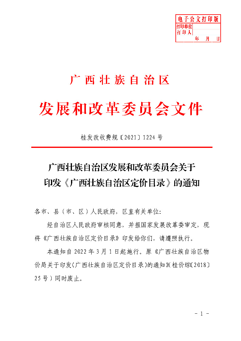 桂发改收费规〔2021〕1224号广西壮族自治区发展和改革委员会关于印发《广西壮族自治区定价目录》的通知