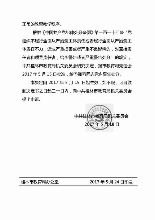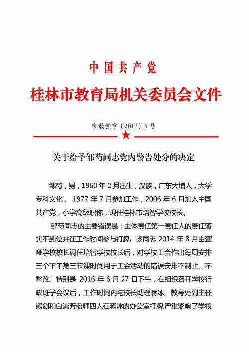 关于给予邹芍同志党内警告处分的决定(市教党字〔2017〕9号,重印件)