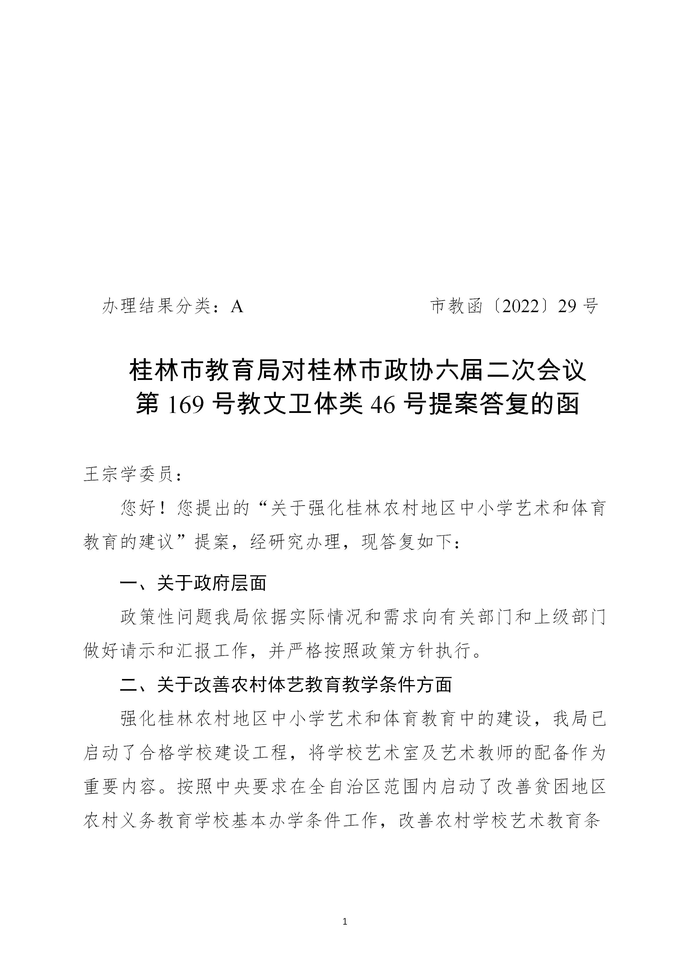市教函【2022】29号 桂林市教育局对桂林市政协六届二次会议第169号教文卫体类46号提案答复的函