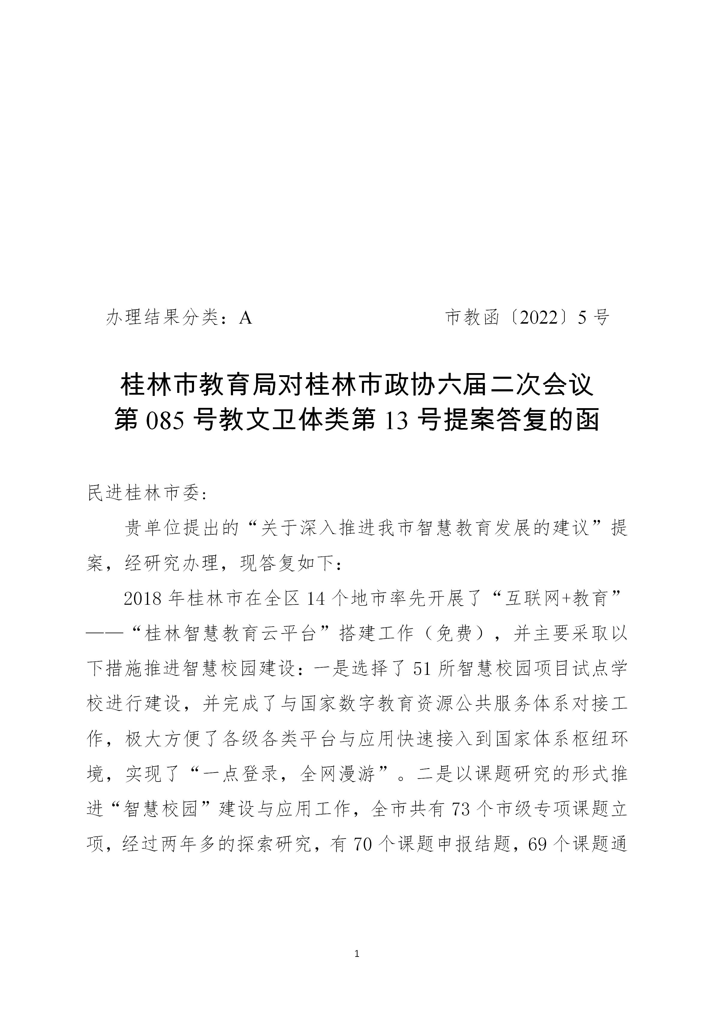 市教函【2022】5 号 桂林市教育局对桂林市政协六届二次会议第085号教文卫体类第13号提案答复的函